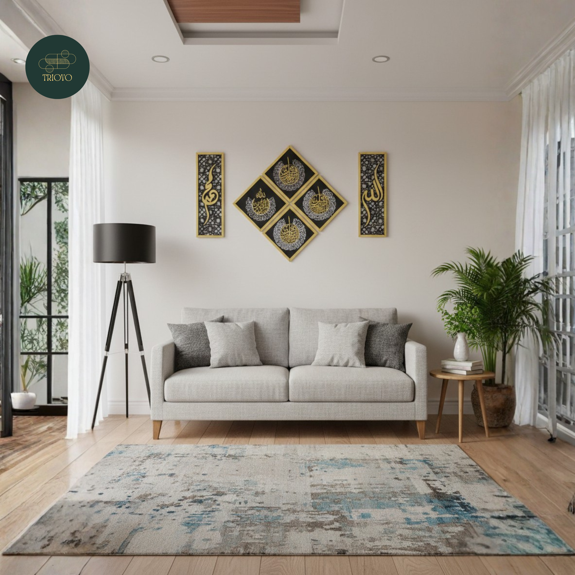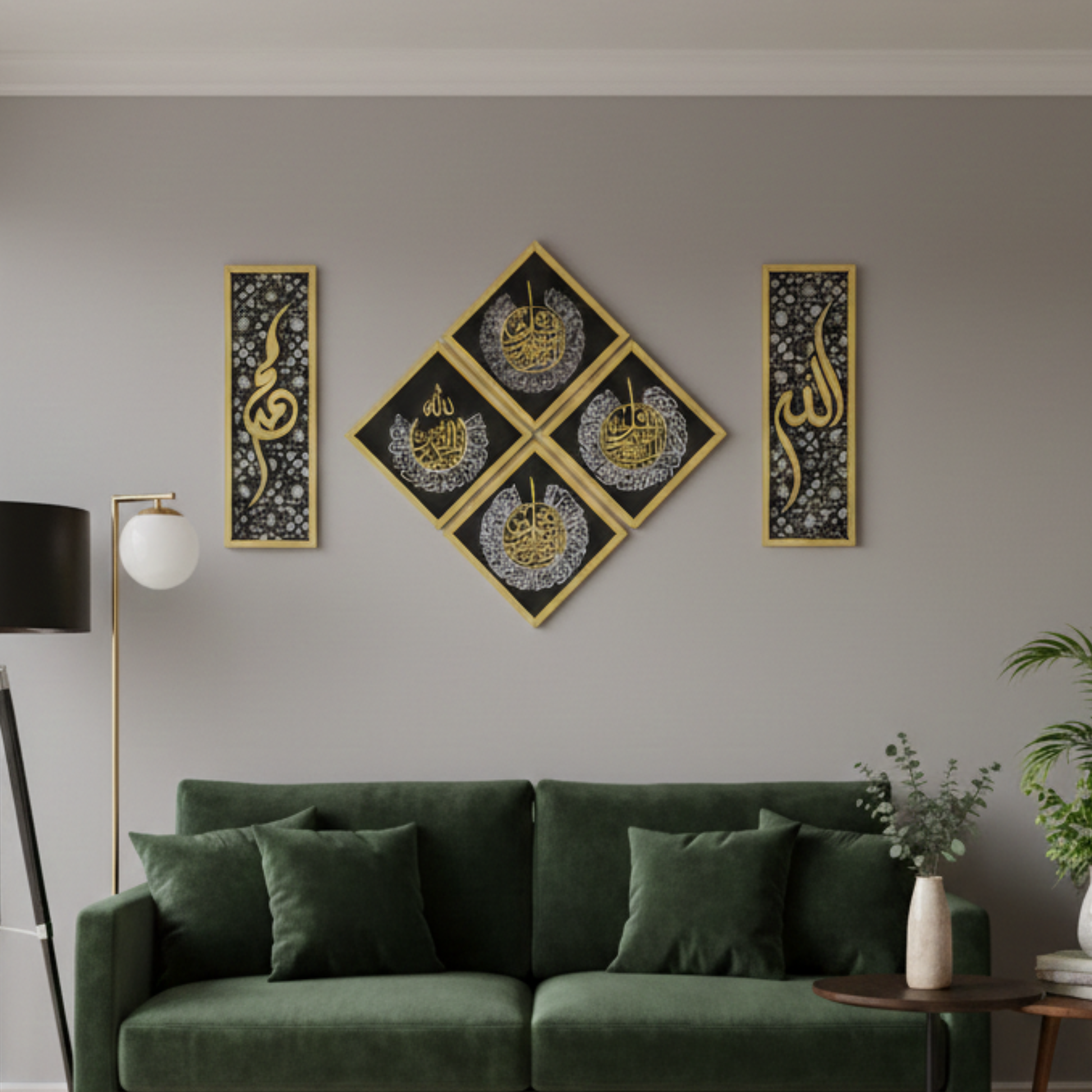 Elevate your home's spiritual ambiance with this striking diamond-shaped Islamic wall art featuring four revered Surahs: Ayatul Kursi, Falaq, Nas, and Ikhlas. Measuring 33x33 inches, this substantial piece combines traditional Islamic calligraphy with contemporary geometric design, making it an ideal focal point for living rooms, prayer spaces, or bedrooms. Crafted with attention to detail, it serves as both a meaningful religious reminder and an elegant decorative element that complements modern and traditional interiors alike. Perfect for those seeking to infuse their space with spiritual significance and artistic sophistication.